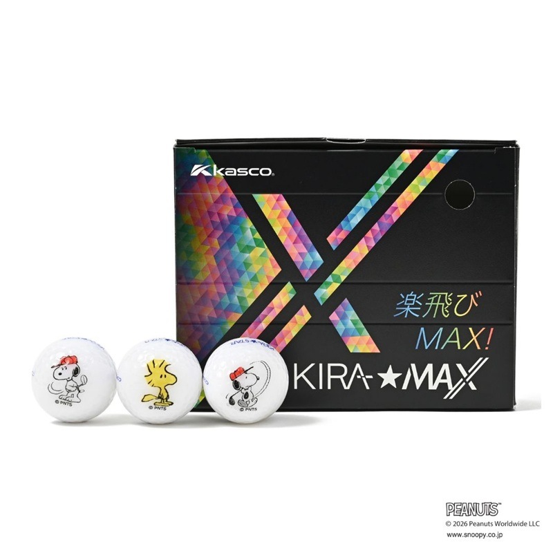 【DELSOLxPEANUTS】コラボのゴルフボールです。Kascoの「KIRA★MAX」に、スヌーピーとウッドストックをプリントしたDELSOL GOLFオリジナルアイテム。