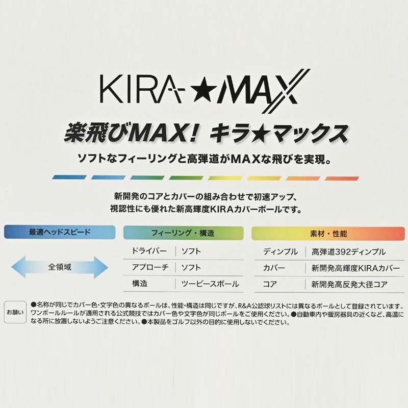 対象:ユニセックス 構造:ツーピースボール 素材・性能:ディンプル/高弾道392ディンプル、カバー/新開発高輝度KIRAカバー、コア/新開発高反発大径コア