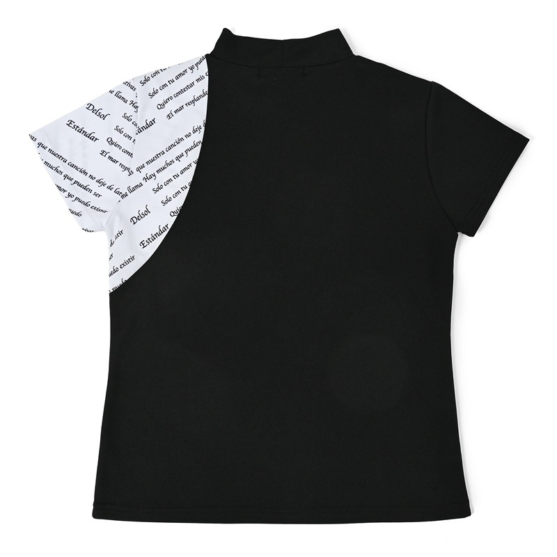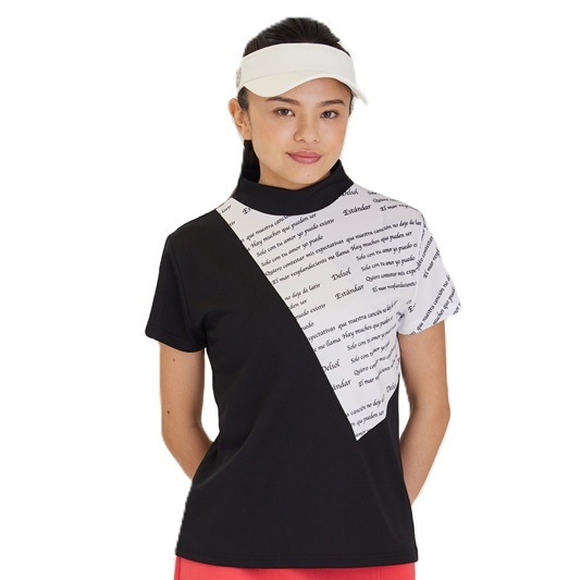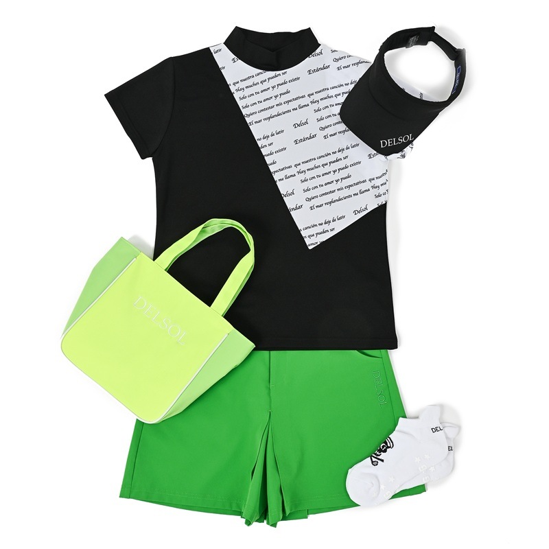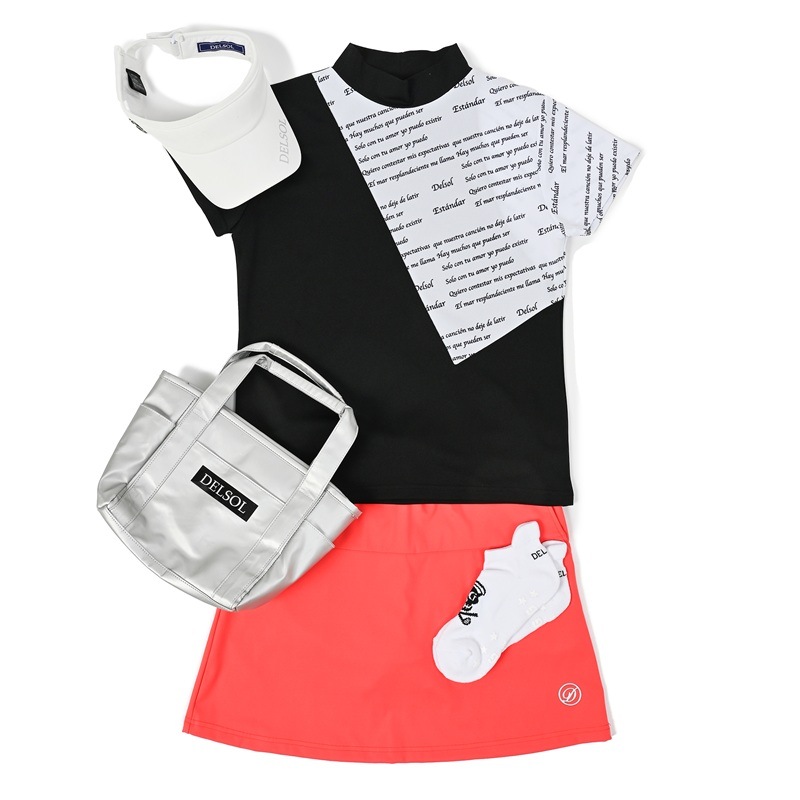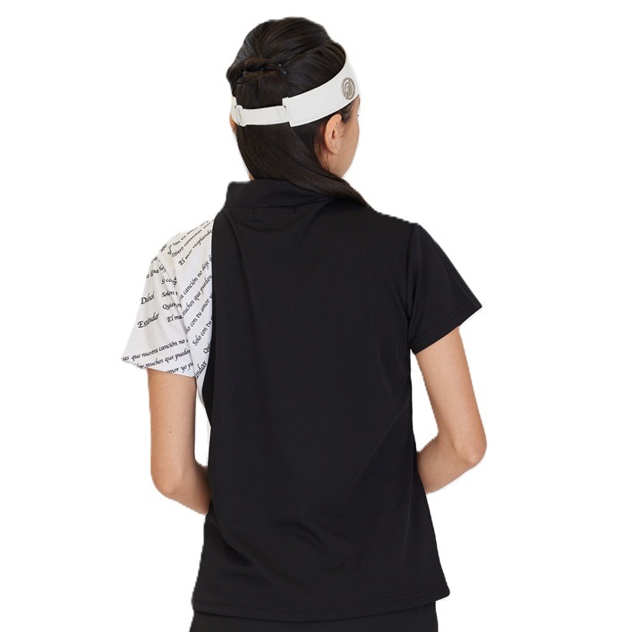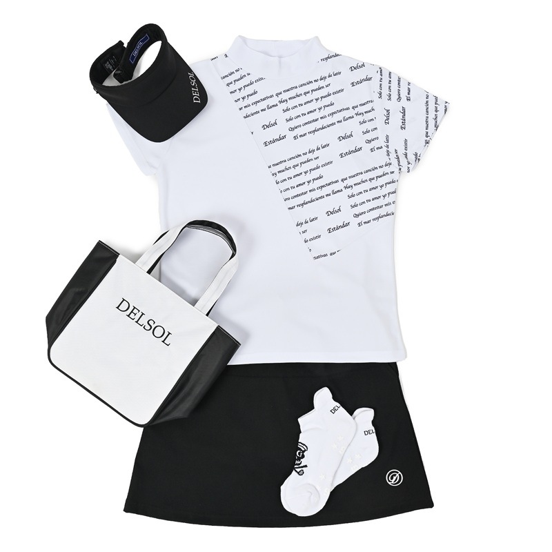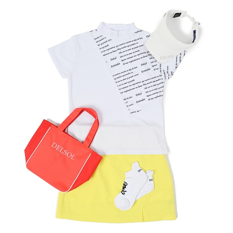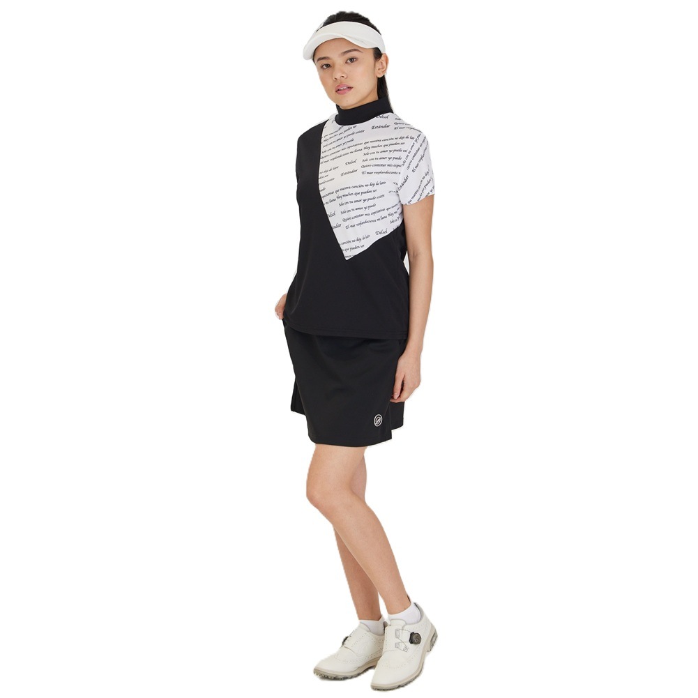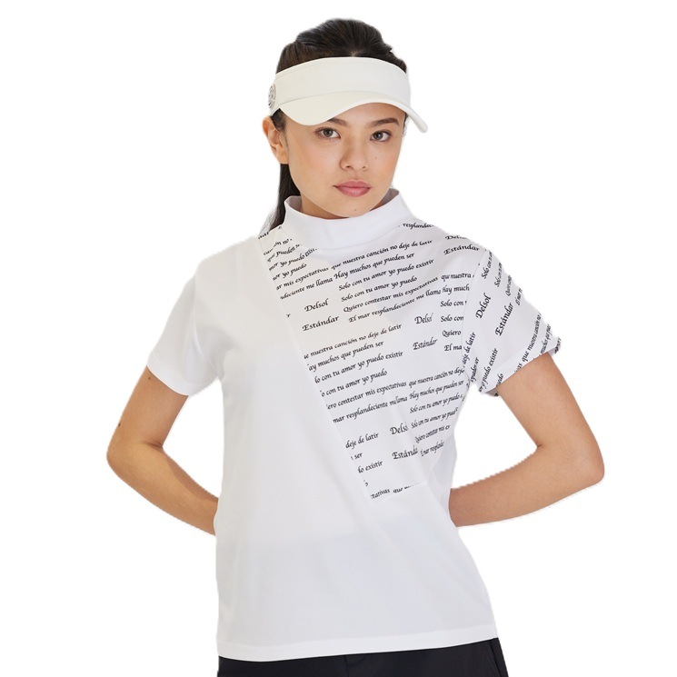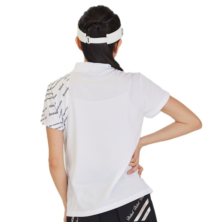 エリ:ハイネック 透け感:WHITEのみややあり 速乾性:◎ モノトーン&ロゴプリントのDELSOLらしいデザインモックネックシャツ 汗をかいても乾きやすい速乾性の生地を使用し、真夏のラウンドも快適に過ごせます。 ボトムスに白黒を合わせても、夏らしいビタミンカラーを合わせてもGOOD。